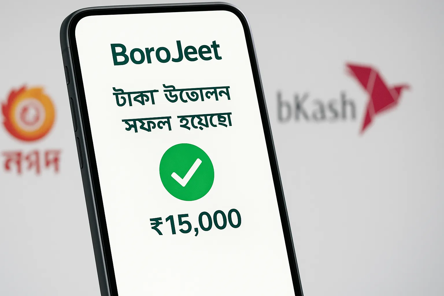 ফি: BoroJeet সাধারণত টাকা তোলার জন্য কোনো ফি নেয় না। তবে, পেমেন্ট প্রোভাইডার (bKash/Nagad) ক্যাশ আউটের জন্য ফি কাটতে পারে।